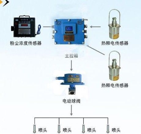 ZP127礦用自動灑水降塵裝置(粉塵超限噴霧)主要由主控箱、電動球閥、熱釋光控傳感器、粉塵濃度傳感器、遙控器、水幕等組成。